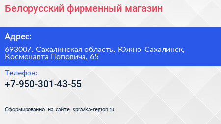 Белорусский фирменный, магазин по адресу 693007, Сахалинская область, Южно-Сахалинск, Космонавта Поповича, 65 в дальнейшем Организация, размещена в следующих категориях:
