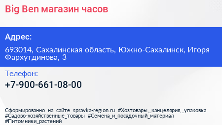 Big Ben, магазин часов по адресу 693014, Сахалинская область, Южно-Сахалинск, Игоря Фархутдинова, 3 в дальнейшем Организация, размещена в следующих категориях: