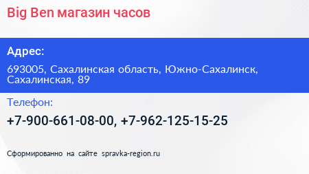 Big Ben, магазин часов по адресу 693005, Сахалинская область, Южно-Сахалинск, Сахалинская, 89 в дальнейшем Организация, размещена в следующих категориях: