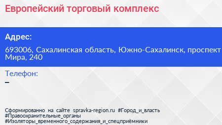 Европейский, торговый комплекс по адресу 693006, Сахалинская область, Южно-Сахалинск, проспект Мира, 240 в дальнейшем Организация, размещена в следующих категориях: