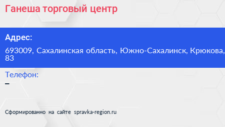 Ганеша, торговый центр по адресу 693009, Сахалинская область, Южно-Сахалинск, Крюкова, 83 в дальнейшем Организация, размещена в следующих категориях: