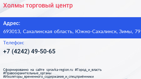 Холмы, торговый центр по адресу 693013, Сахалинская область, Южно-Сахалинск, Зимы, 79 в дальнейшем Организация, размещена в следующих категориях: