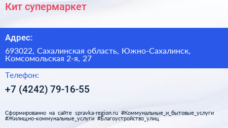Кит, супермаркет по адресу 693022, Сахалинская область, Южно-Сахалинск, Комсомольская 2-я, 27 в дальнейшем Организация, размещена в следующих категориях:
