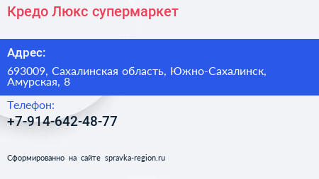 Кредо Люкс, супермаркет по адресу 693009, Сахалинская область, Южно-Сахалинск, Амурская, 8 в дальнейшем Организация, размещена в следующих категориях: