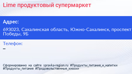 Lime, продуктовый супермаркет по адресу 693023, Сахалинская область, Южно-Сахалинск, проспект Победы, 9Б в дальнейшем Организация, размещена в следующих категориях: