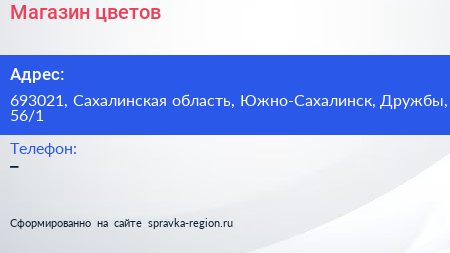 Магазин цветов по адресу 693021, Сахалинская область, Южно-Сахалинск, Дружбы, 56/1 в дальнейшем Организация, размещена в следующих категориях: