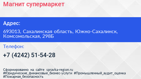 Магнит, супермаркет по адресу 693013, Сахалинская область, Южно-Сахалинск, Комсомольская, 298Б в дальнейшем Организация, размещена в следующих категориях: