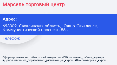 Марсель, торговый центр по адресу 693009, Сахалинская область, Южно-Сахалинск, Коммунистический проспект, 86в в дальнейшем Организация, размещена в следующих категориях: