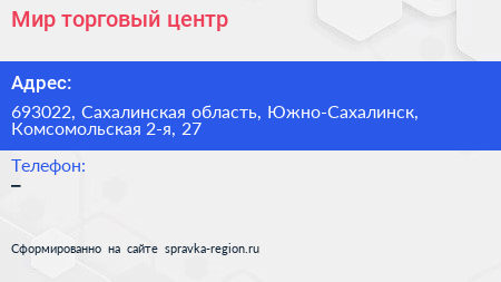 Мир, торговый центр по адресу 693022, Сахалинская область, Южно-Сахалинск, Комсомольская 2-я, 27 в дальнейшем Организация, размещена в следующих категориях: