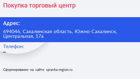 Покупка, торговый центр по адресу 694046, Сахалинская область, Южно-Сахалинск, Центральная, 17а в дальнейшем Организация, размещена в следующих категориях: