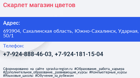 Скарлет, магазин цветов по адресу 693904, Сахалинская область, Южно-Сахалинск, Ударная, 50/1 в дальнейшем Организация, размещена в следующих категориях: