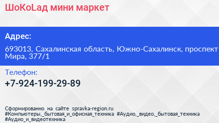 ШоКоLад, мини-маркет по адресу 693013, Сахалинская область, Южно-Сахалинск, проспект Мира, 377/1 в дальнейшем Организация, размещена в следующих категориях: