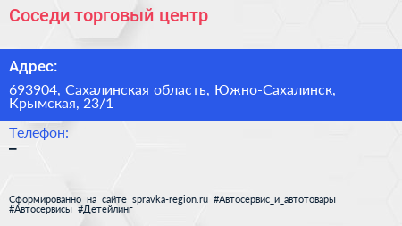 Соседи, торговый центр по адресу 693904, Сахалинская область, Южно-Сахалинск, Крымская, 23/1 в дальнейшем Организация, размещена в следующих категориях: