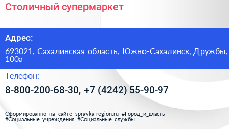 Столичный, супермаркет по адресу 693021, Сахалинская область, Южно-Сахалинск, Дружбы, 100а в дальнейшем Организация, размещена в следующих категориях: