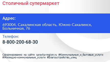Столичный, супермаркет по адресу 693004, Сахалинская область, Южно-Сахалинск, Больничная, 76 в дальнейшем Организация, размещена в следующих категориях: