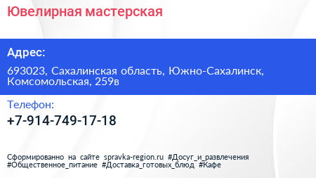 Ювелирная мастерская по адресу 693023, Сахалинская область, Южно-Сахалинск, Комсомольская, 259в в дальнейшем Организация, размещена в следующих категориях: