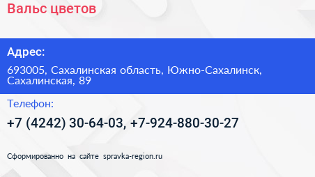 Вальс цветов по адресу 693005, Сахалинская область, Южно-Сахалинск, Сахалинская, 89 в дальнейшем Организация, размещена в следующих категориях: