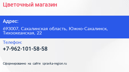 Цветочный магазин по адресу 693007, Сахалинская область, Южно-Сахалинск, Тихоокеанская, 22 в дальнейшем Организация, размещена в следующих категориях: