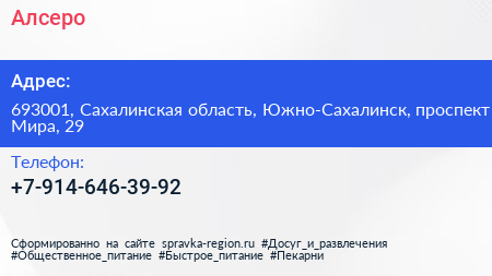 Алсеро по адресу 693001, Сахалинская область, Южно-Сахалинск, проспект Мира, 29 в дальнейшем Организация, размещена в следующих категориях: