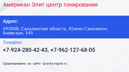 Американ Элит, центр тонирования по адресу 693008, Сахалинская область, Южно-Сахалинск, Анивская, 145 в дальнейшем Организация, размещена в следующих категориях: