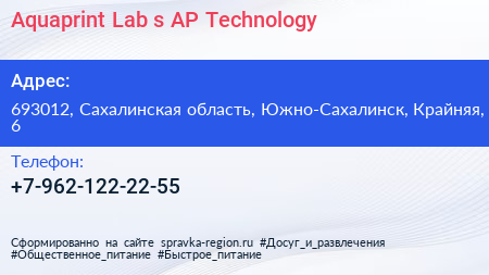 Aquaprint Lab`s & AP Technology по адресу 693012, Сахалинская область, Южно-Сахалинск, Крайняя, 6 в дальнейшем Организация, размещена в следующих категориях: