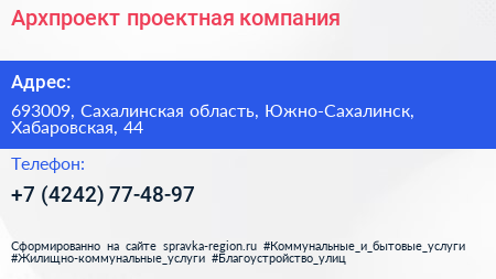 Архпроект, проектная компания по адресу 693009, Сахалинская область, Южно-Сахалинск, Хабаровская, 44 в дальнейшем Организация, размещена в следующих категориях: