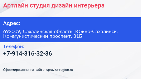 Артлайн, студия дизайн интерьера по адресу 693009, Сахалинская область, Южно-Сахалинск, Коммунистический проспект, 31Б в дальнейшем Организация, размещена в следующих категориях:
