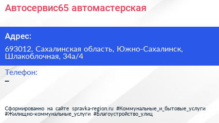 Автосервис65, автомастерская по адресу 693012, Сахалинская область, Южно-Сахалинск, Шлакоблочная, 34а/4 в дальнейшем Организация, размещена в следующих категориях: