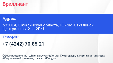Бриллиант по адресу 693014, Сахалинская область, Южно-Сахалинск, Центральная 2-я, 2Б/1 в дальнейшем Организация, размещена в следующих категориях: