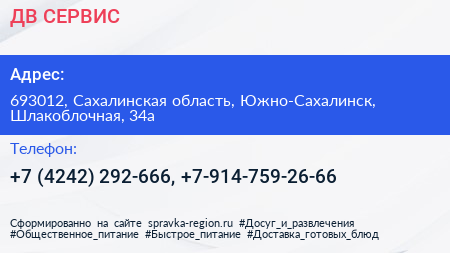 ДВ СЕРВИС по адресу 693012, Сахалинская область, Южно-Сахалинск, Шлакоблочная, 34а в дальнейшем Организация, размещена в следующих категориях:
