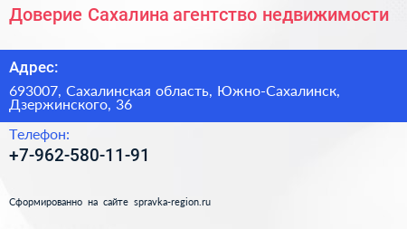 Доверие Сахалина, агентство недвижимости по адресу 693007, Сахалинская область, Южно-Сахалинск, Дзержинского, 36 в дальнейшем Организация, размещена в следующих категориях: