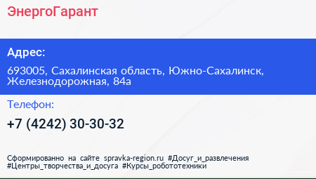 ЭнергоГарант по адресу 693005, Сахалинская область, Южно-Сахалинск, Железнодорожная, 84а в дальнейшем Организация, размещена в следующих категориях: