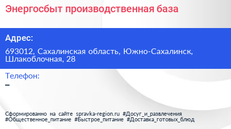 Энергосбыт, производственная база по адресу 693012, Сахалинская область, Южно-Сахалинск, Шлакоблочная, 28 в дальнейшем Организация, размещена в следующих категориях: