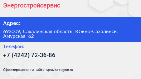 Энергостройсервис по адресу 693009, Сахалинская область, Южно-Сахалинск, Амурская, 62 в дальнейшем Организация, размещена в следующих категориях: