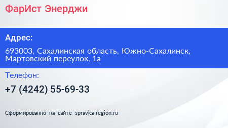 ФарИст-Энерджи по адресу 693003, Сахалинская область, Южно-Сахалинск, Мартовский переулок, 1а в дальнейшем Организация, размещена в следующих категориях: