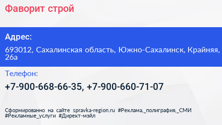 Фаворит строй по адресу 693012, Сахалинская область, Южно-Сахалинск, Крайняя, 26а в дальнейшем Организация, размещена в следующих категориях: