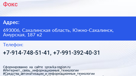 Фокс по адресу 693006, Сахалинская область, Южно-Сахалинск, Амурская, 187 к2 в дальнейшем Организация, размещена в следующих категориях: