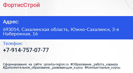 ФортисСтрой по адресу 693014, Сахалинская область, Южно-Сахалинск, 3-я Набережная, 16 в дальнейшем Организация, размещена в следующих категориях: