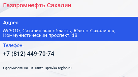 Газпромнефть-Cахалин по адресу 693010, Сахалинская область, Южно-Сахалинск, Коммунистический проспект, 18 в дальнейшем Организация, размещена в следующих категориях:
