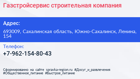 Газстройсервис, строительная компания по адресу 693009, Сахалинская область, Южно-Сахалинск, Ленина, 154 в дальнейшем Организация, размещена в следующих категориях:
