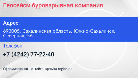 Геосейсм, буровзрывная компания по адресу 693005, Сахалинская область, Южно-Сахалинск, Северная, 56 в дальнейшем Организация, размещена в следующих категориях: