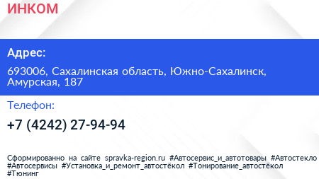 ИНКОМ по адресу 693006, Сахалинская область, Южно-Сахалинск, Амурская, 187 в дальнейшем Организация, размещена в следующих категориях: