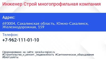 Инженер-Строй, многопрофильная компания по адресу 693004, Сахалинская область, Южно-Сахалинск, Железнодорожная, 159 в дальнейшем Организация, размещена в следующих категориях: