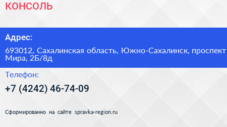 КОНСОЛЬ по адресу 693012, Сахалинская область, Южно-Сахалинск, проспект Мира, 2Б/8д в дальнейшем Организация, размещена в следующих категориях: