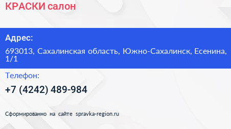 КРАСКИ, салон по адресу 693013, Сахалинская область, Южно-Сахалинск, Есенина, 1/1 в дальнейшем Организация, размещена в следующих категориях:
