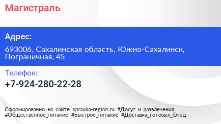 Магистраль по адресу 693006, Сахалинская область, Южно-Сахалинск, Пограничная, 45 в дальнейшем Организация, размещена в следующих категориях: