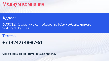 Медиум, компания по адресу 693012, Сахалинская область, Южно-Сахалинск, Физкультурная, 1 в дальнейшем Организация, размещена в следующих категориях: