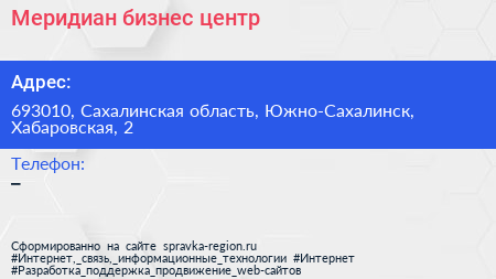 Меридиан, бизнес-центр по адресу 693010, Сахалинская область, Южно-Сахалинск, Хабаровская, 2 в дальнейшем Организация, размещена в следующих категориях: