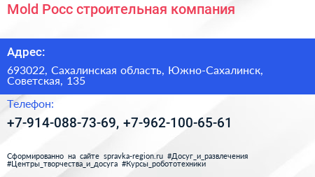 Mold Pocc, строительная компания по адресу 693022, Сахалинская область, Южно-Сахалинск, Советская, 135 в дальнейшем Организация, размещена в следующих категориях: