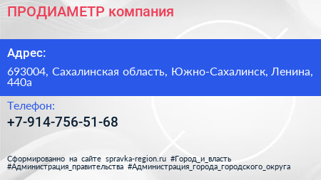 ПРОДИАМЕТР, компания по адресу 693004, Сахалинская область, Южно-Сахалинск, Ленина, 440а в дальнейшем Организация, размещена в следующих категориях: